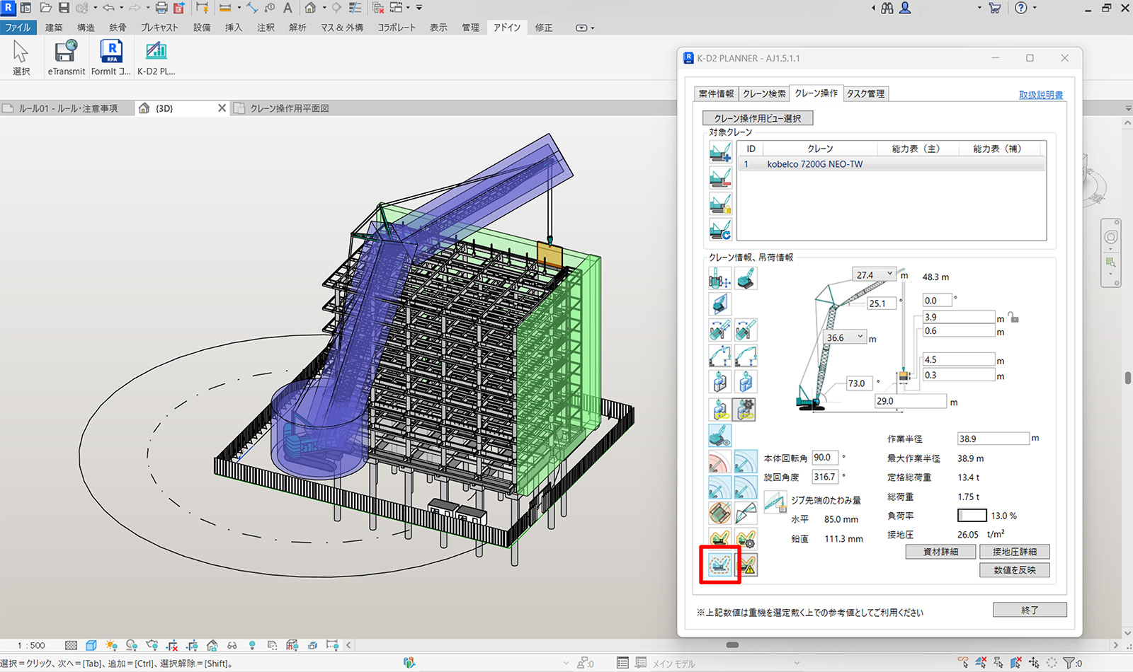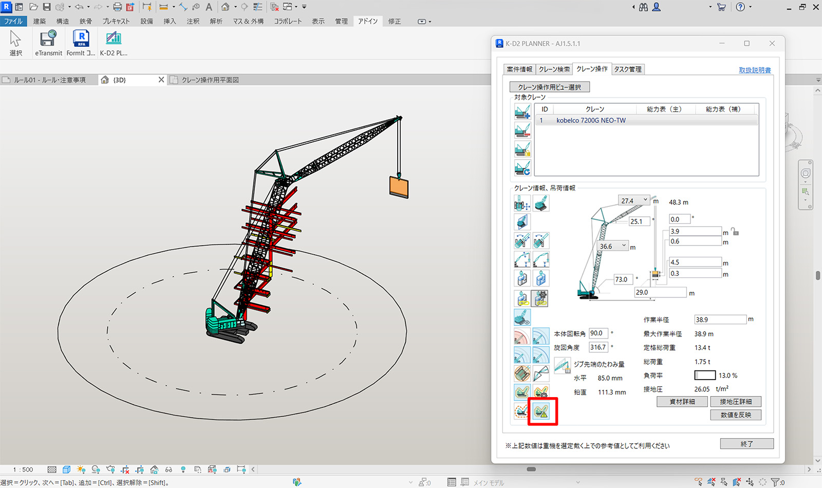 「干渉チェック」機能の利用時、3D画面上で検討したい資材をクリックするたびに、「クレーンと干渉している資材」と