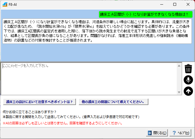 「床止めの構造設計手引き(財)国土技術研究センター 編」等に従い、直壁型及び緩傾斜型の落差工の設計計算及び図面作成を行うプログラムです。