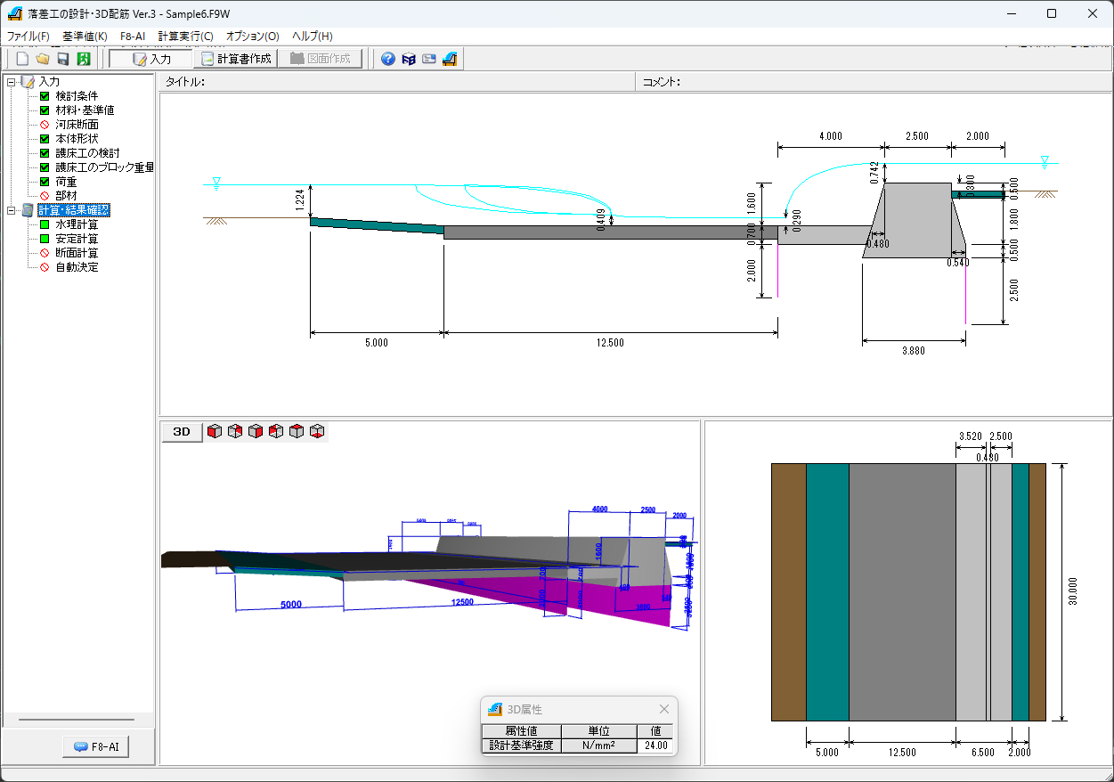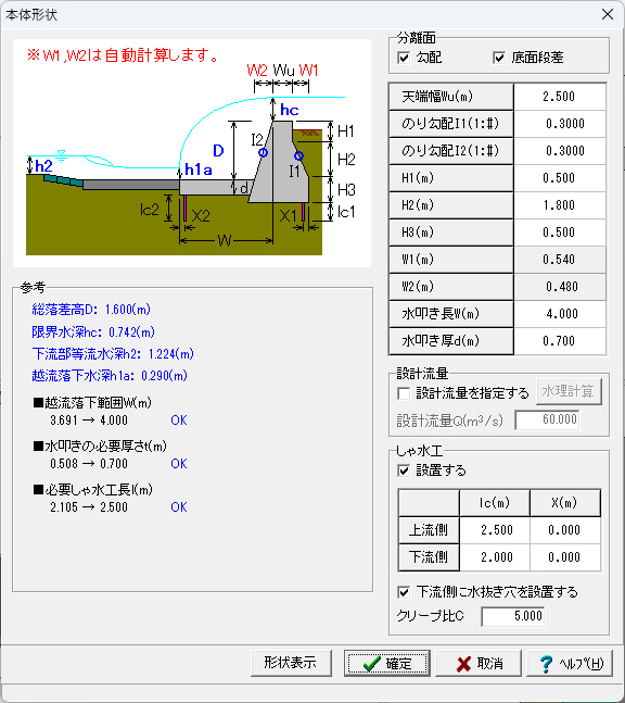 また、直壁型(一体式構造)で鉄筋コンクリート部材の場合は、本体と水叩き部について、断面計算(曲げ応力度、せん断応力度)を行うことが可能です。