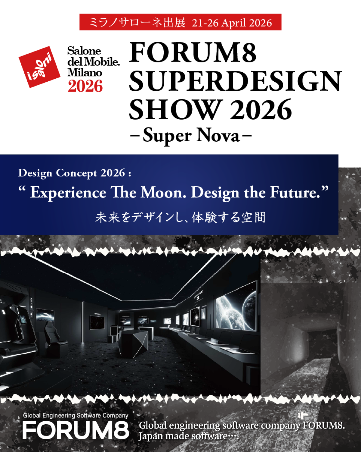 「FORUM8 — Experience the Moon. Design the Future.」をテーマに、防災・環境・社会インフラに貢献するJapan-madeエンジニアリングソフトウェアと、その中核を成すミドルウェア型システム基盤を発表します。