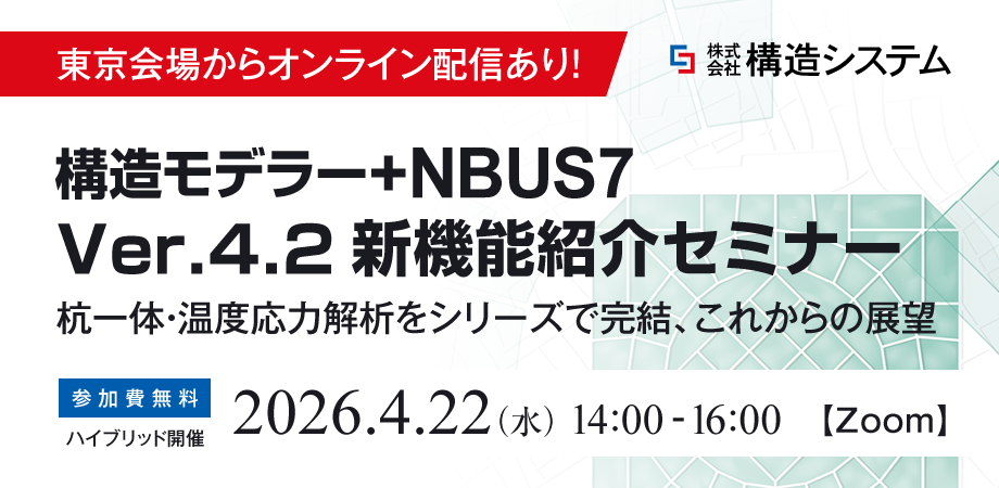 当セミナーでは「杭一体解析」や「温度応力」への対応など、構造モデラー+NBUS7 Ver.4.2の主な機能について解説いたします。また節点同一化や周辺ソフトの充実など、これまでの進化についても改めて紹介いたします。更に、テキストデータ入出力など今後計画している機能の進化、BUS-6データの活用に関するQ&A情報もお知らせします。